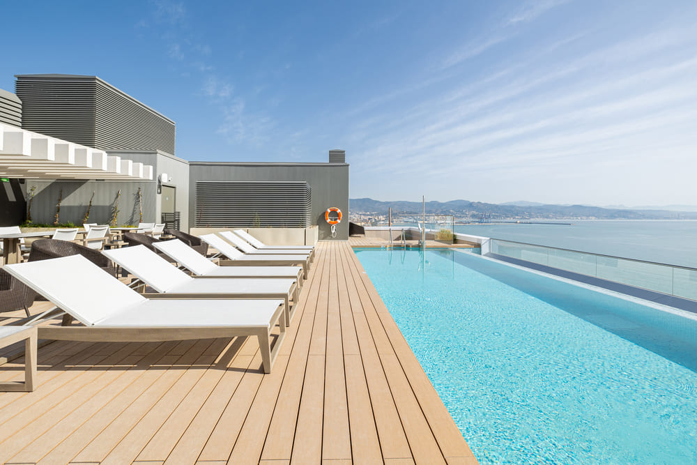 - Tarimas exteriores en tonos claros. Los suelos claros, ya sean naturales o tarimas sintéticas, son ideales para zonas muy soleadas, ya que se calientan menos y son más cómodos.